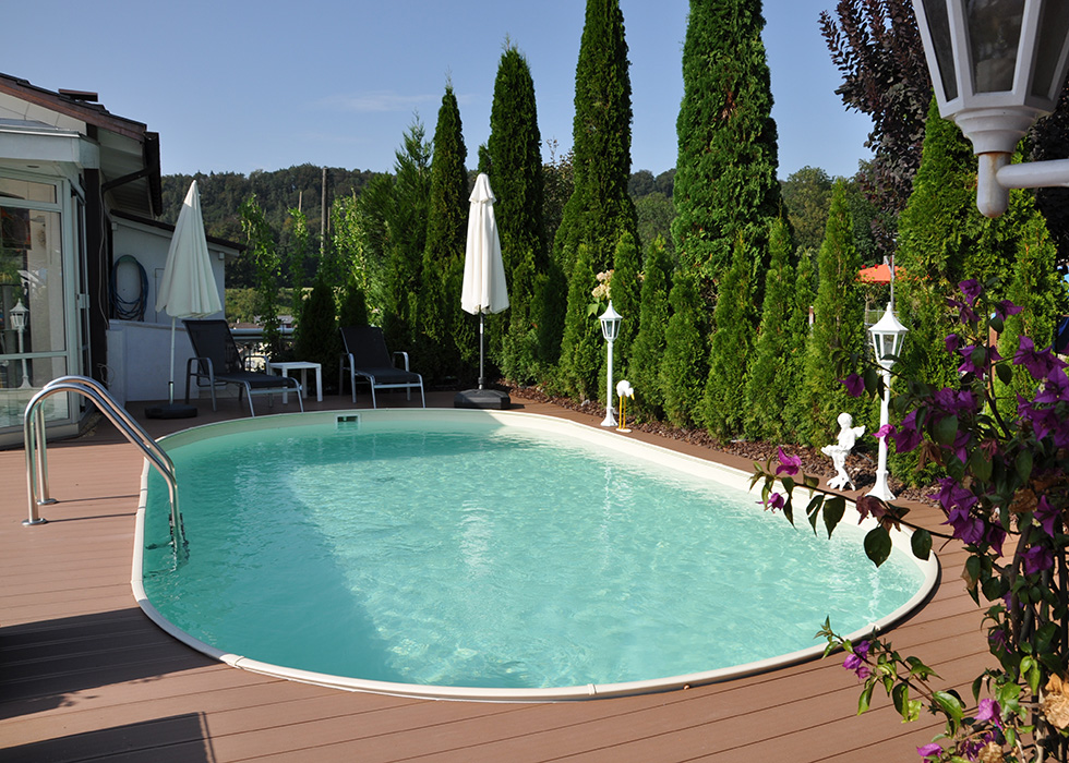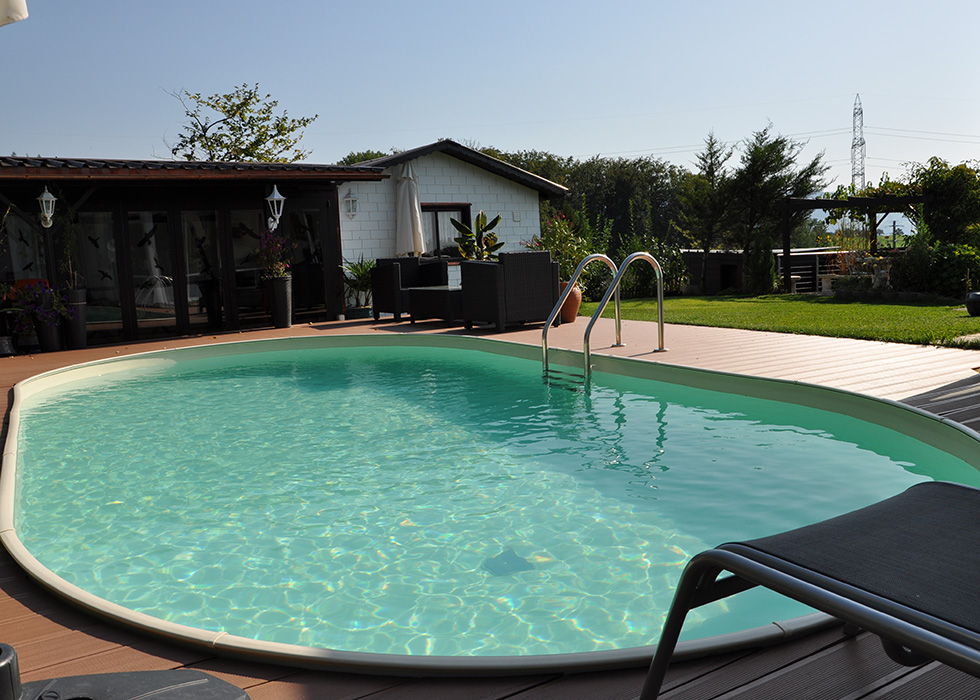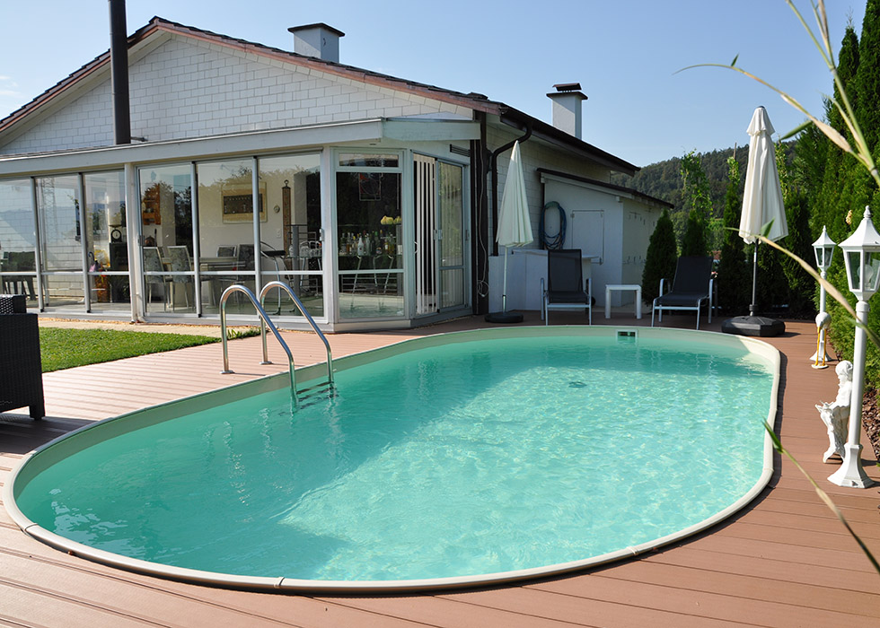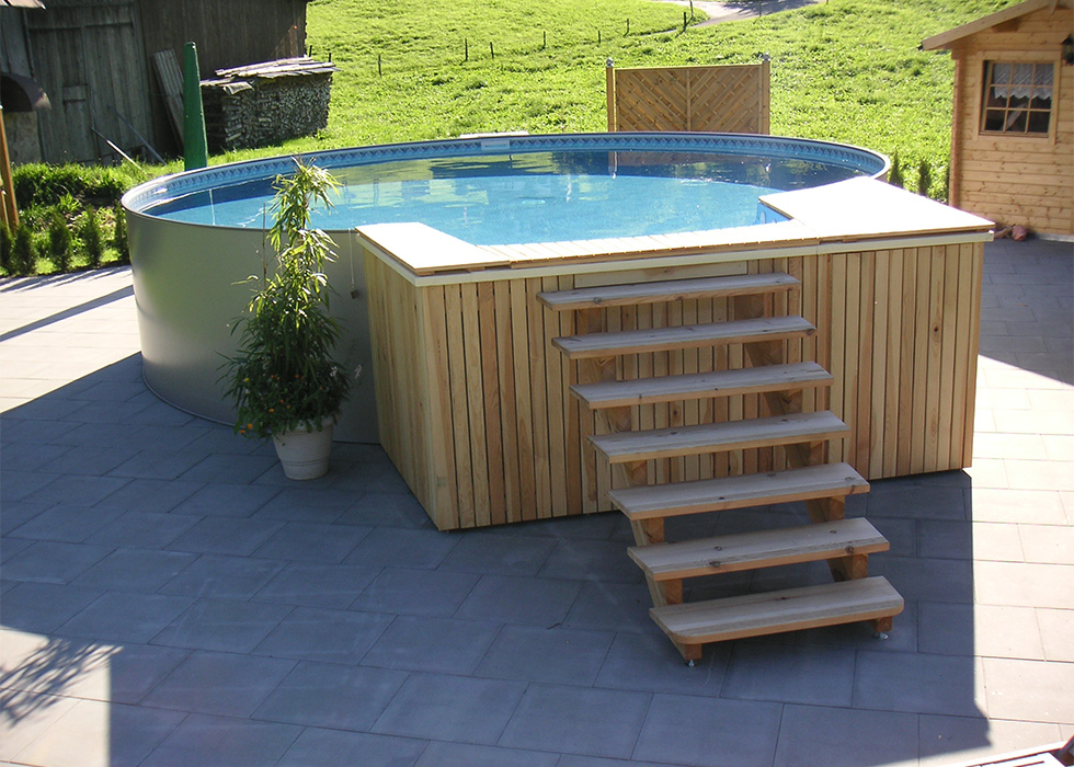Diese Aufstellbecken sind aus qualitativ hochwertigem deutschem Stahl und verfügen über einen stabilen Kombihandlauf aus PVC bzw. Aluminium. Die Rund- und Achtformbäder können auf dem Boden aufgestellt oder teilweise oder komplett versenkt werden. Das Ovalformbad hingegen benötigt Stützmauern an den Längsseiten.